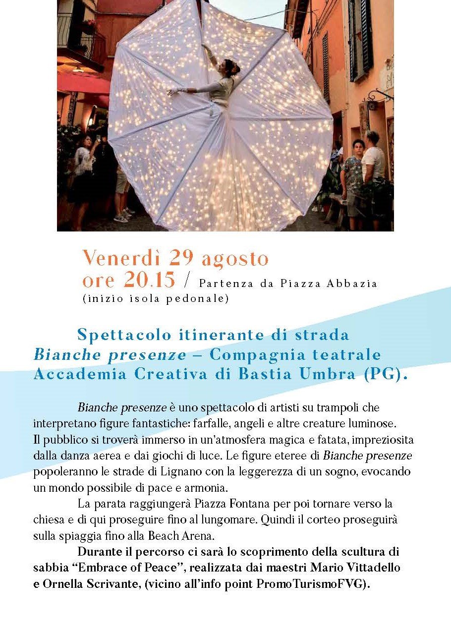- Straßenparade „Bianche presenze“ der Accademia Creativa: Stelzenläufer, Schmetterlinge, Engel und leuchtende Figuren schaffen eine zauberhafte Atmosphäre bis hin zum Meer.
