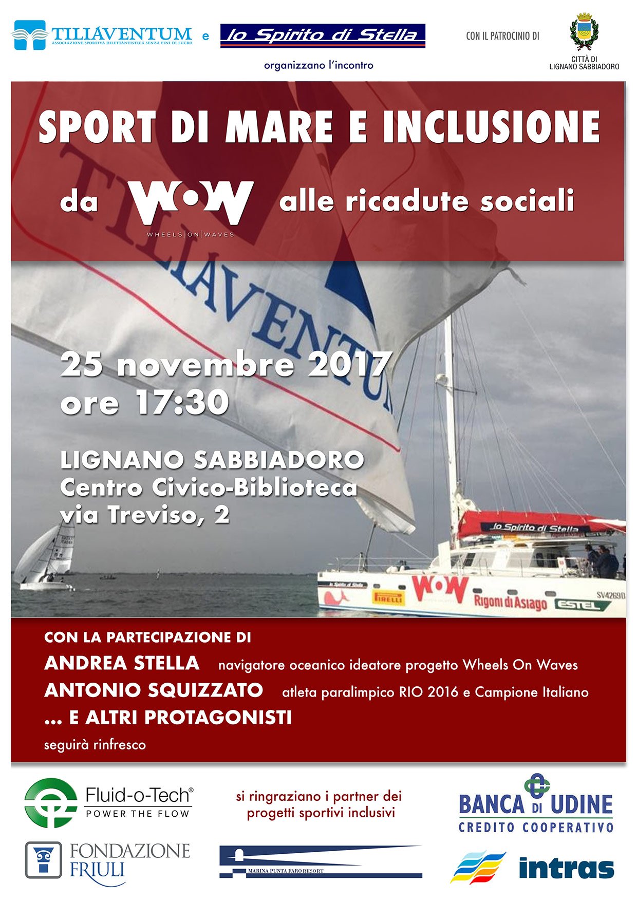 Tiliaventum asd e Lo Spirito di Stella Onlus si occupano da molti da molti anni di inclusione attraverso le discipline sportive di mare (in particolare vela, kitesurf, windsurf, seacyclcing, sup) e l'occasione nasce dalla recente esperienza WOW - Wheels On Waves, una navigazione a vela da Miami a Trieste a bordo del catamarano accessibile Lo Spirito di Stella, con l'equipaggio Tiliaventum nella trasferta più impegnativa, la traversata transatlantica New York-Portimao (POR), equipaggio composto anche da 2 disabili non passeggeri, ma attivissimi velisti sia negli impegnativi turni di navigazione, che nelle incombenze quotidiane.