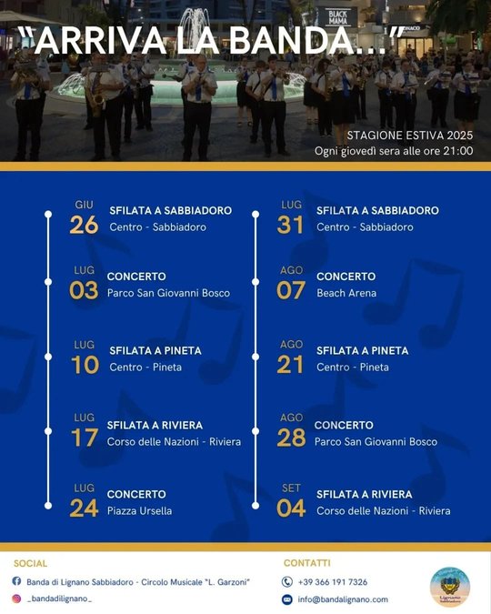 The Circolo Musicale “L. Garzoni” presents “The Band is Coming…”, a series of concerts and parades held every Thursday evening at 9:00 PM in the town of Lignano Sabbiadoro.