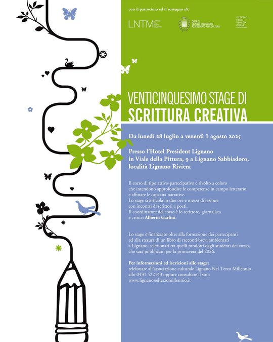 The cultural association "Lignano nel terzo millennio" is organizing the 25th edition of the Creative Writing Workshop, taking place from Monday, July 28 to Friday, August 1, 2025, at Hotel President Lignano in Lignano Sabbiadoro.