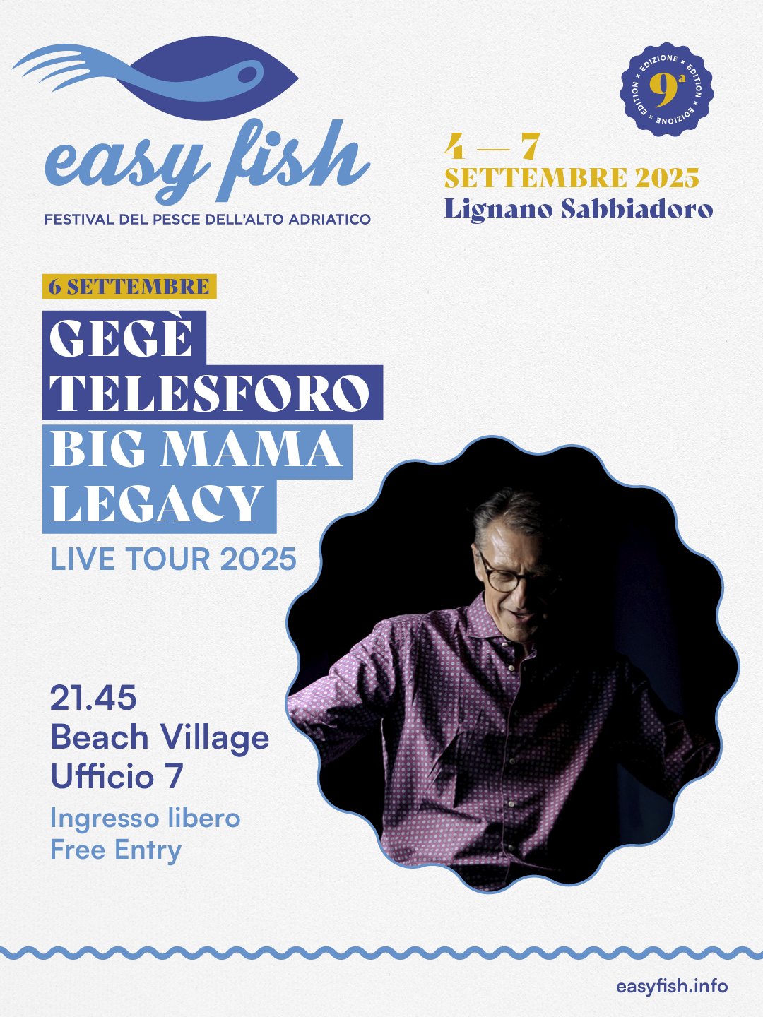 As part of Easy Fish – The Festival of Upper Adriatic Seafood, on Saturday, 6 September 2025 at 9:45 PM a special event will take place at the Beach Village, Lignano Sabbiadoro: GeGè Telesforo with his brand-new live project.