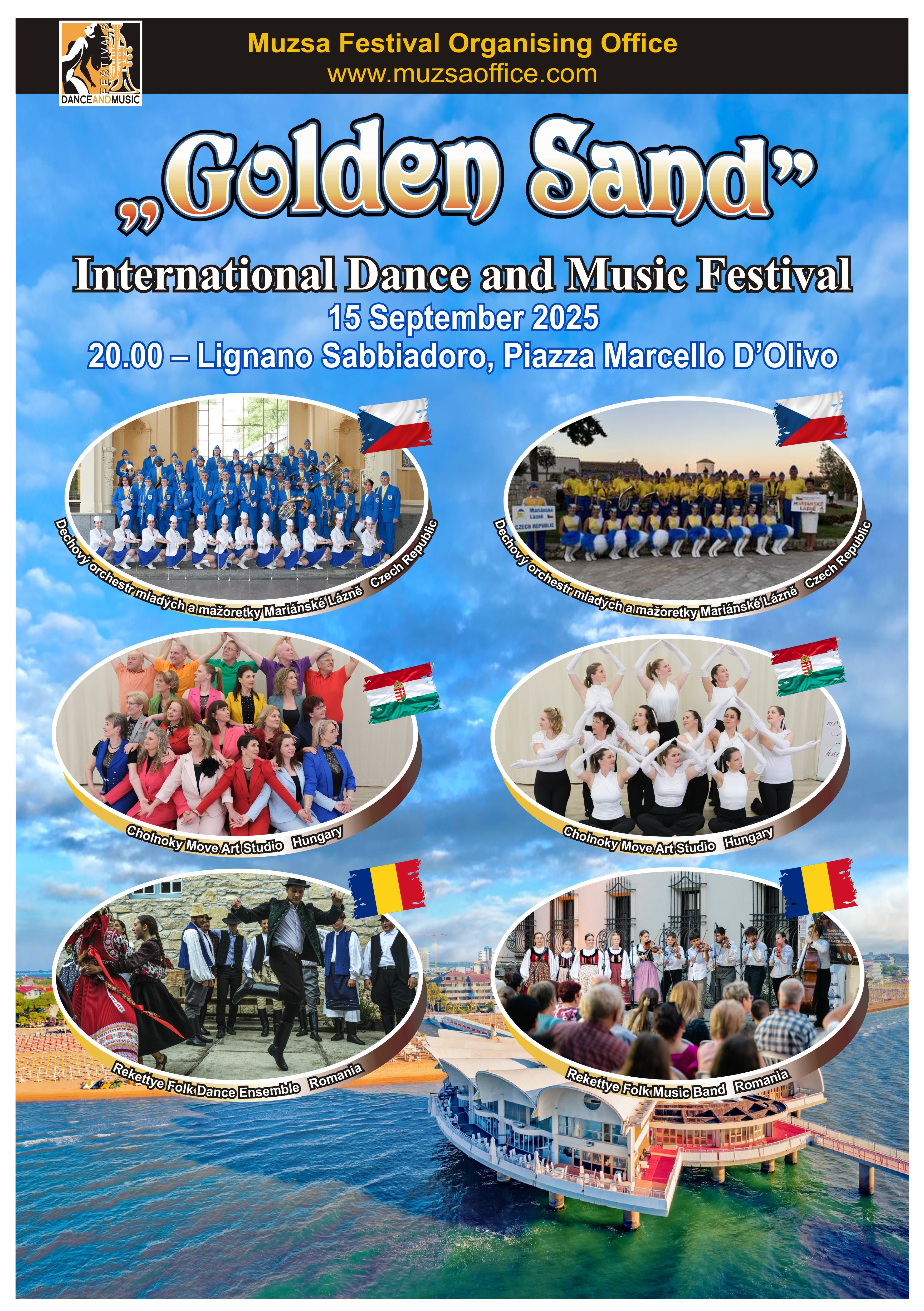 Monday, 15 September 2025, from 8:00 PM enjoy an evening of music, dance and international culture in Piazza Marcello D’Olivo, Lignano Pineta with the Golden Sand Festival, an event that brings on stage groups and artists from different European countries.