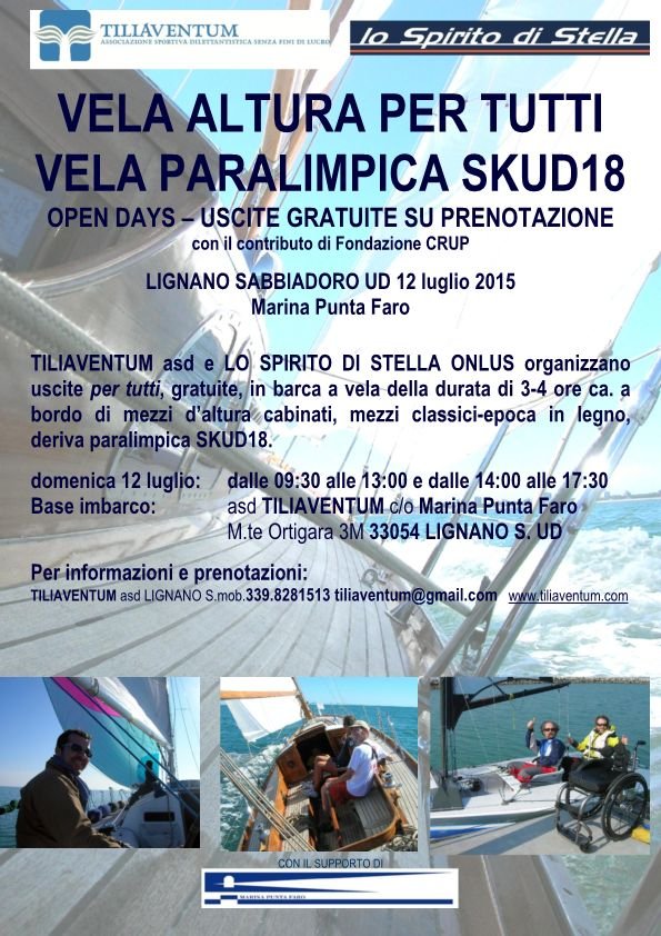 asd TILIAVENTUM e LO SPIRITO DI STELLA ONLUS, con il supporto logistico di Marina Punta Faro, organizzano uscite per tutti, gratuite, in barca a vela della durata di 3 - 4 ore a bordo di mezzi d’altura cabinati, mezzi classici-epoca in legno, deriva paralimpica SKUD18.