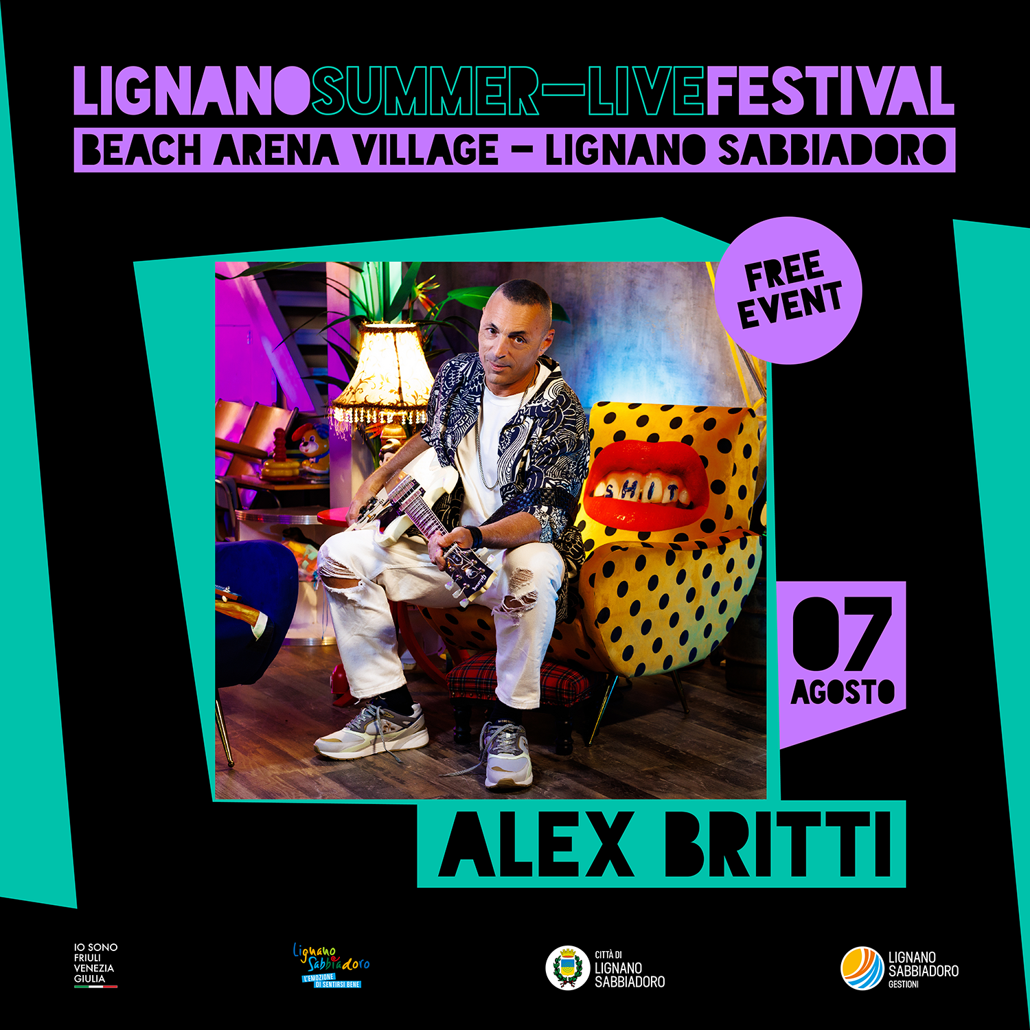 Alessandro Britti, detto Alex, il cantautore e chitarrista romano classe 1968, accompagnato dalla sua band (Francesco Isola – batteria, Matteo Pezzolet - basso, Davide Sambrotta – tastiere e sequenze, Cassandra De Rosa, Oumy N’Diaye e Deborah Romano - coro) porta in scena un live coinvolgente ed energico frutto di lungo lavoro, anello di congiunzione tra passato e presente della sua storia musicale. Il pubblico delle arene, delle piazze e dei festival estivi italiani potrà lasciarsi conquistare dal sound inconfondibile, dalla leggerezza e dalle sonorità blues e rock che da sempre contraddistinguono il repertorio del chitarrista romano e godersi ogni attimo di questo show speciale, in cui ci sarà spazio solo per la musica e dove Alex Britti rivelerà entrambe le sue due anime pop e cantautorale. Sarà l’occasione perfetta per ascoltare i nuovi brani Tutti come te e Nuda delle vere e proprie hit a tutto ritmo con testi sinceri e riff iconici in cui si sentono i tocchi di chitarra di Alex Britti unici e inimitabili ma anche successi del passato come Solo una volta (o tutta la vita), Oggi sono io, La Vasca, 7000 caffè, Lo zingaro felice, Gelido, Baciami (e portami a ballare) solo per citarne alcuni.