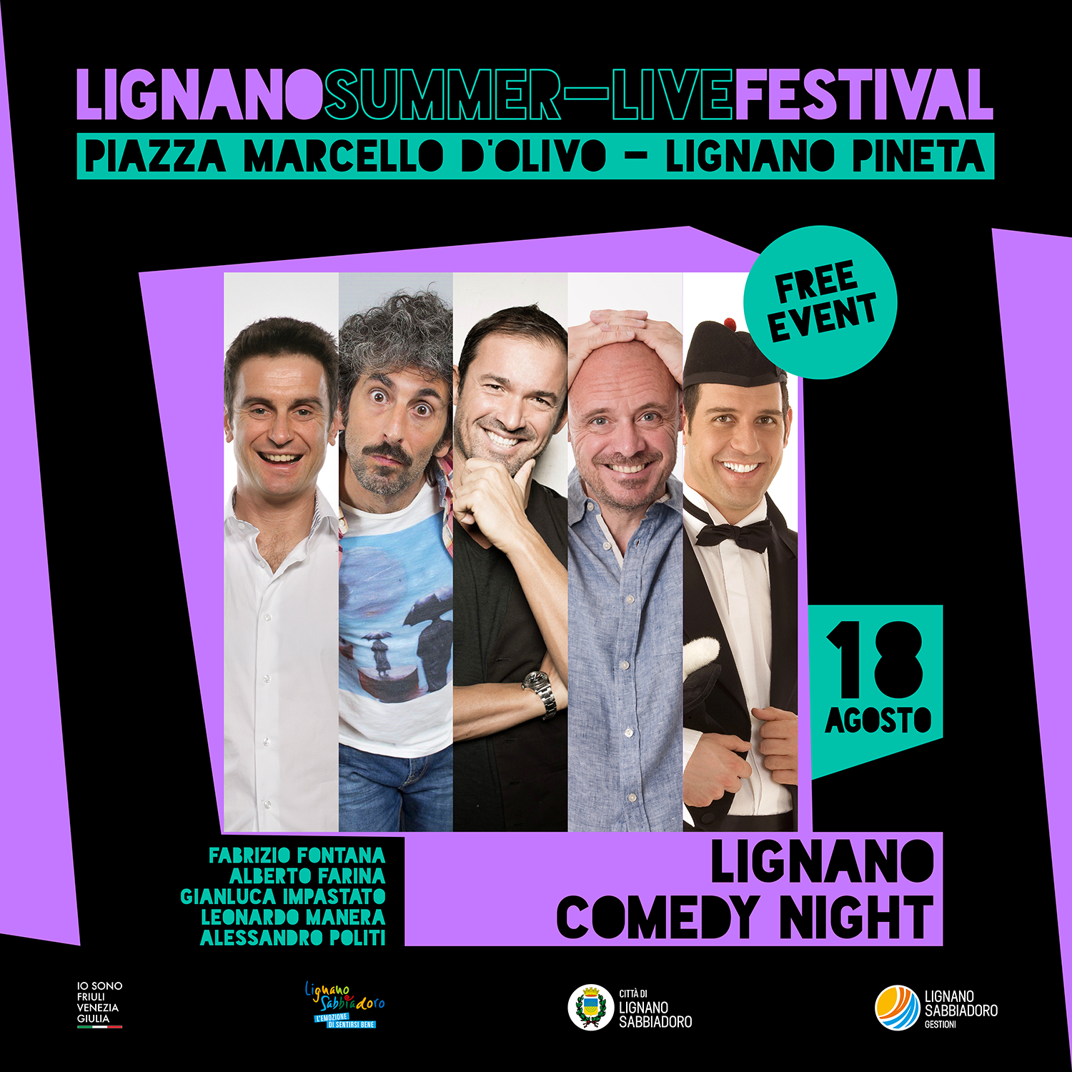 “Comedy Night”, una serata all’insegna della comicità con alcuni dei volti più famosi della televisione. Tra i protagonisti di questo esilarante spettacolo ci sono Gianluca Impastato, Fabrizio Fontana in arte Capitan Ventosa, Leonardo Manera, Alberto Farina e Alessandro Politi. I cinque personaggi comici hanno ideato uno spettacolo ad hoc per la nostra località riservandoci grandi sorprese e grosse risate.