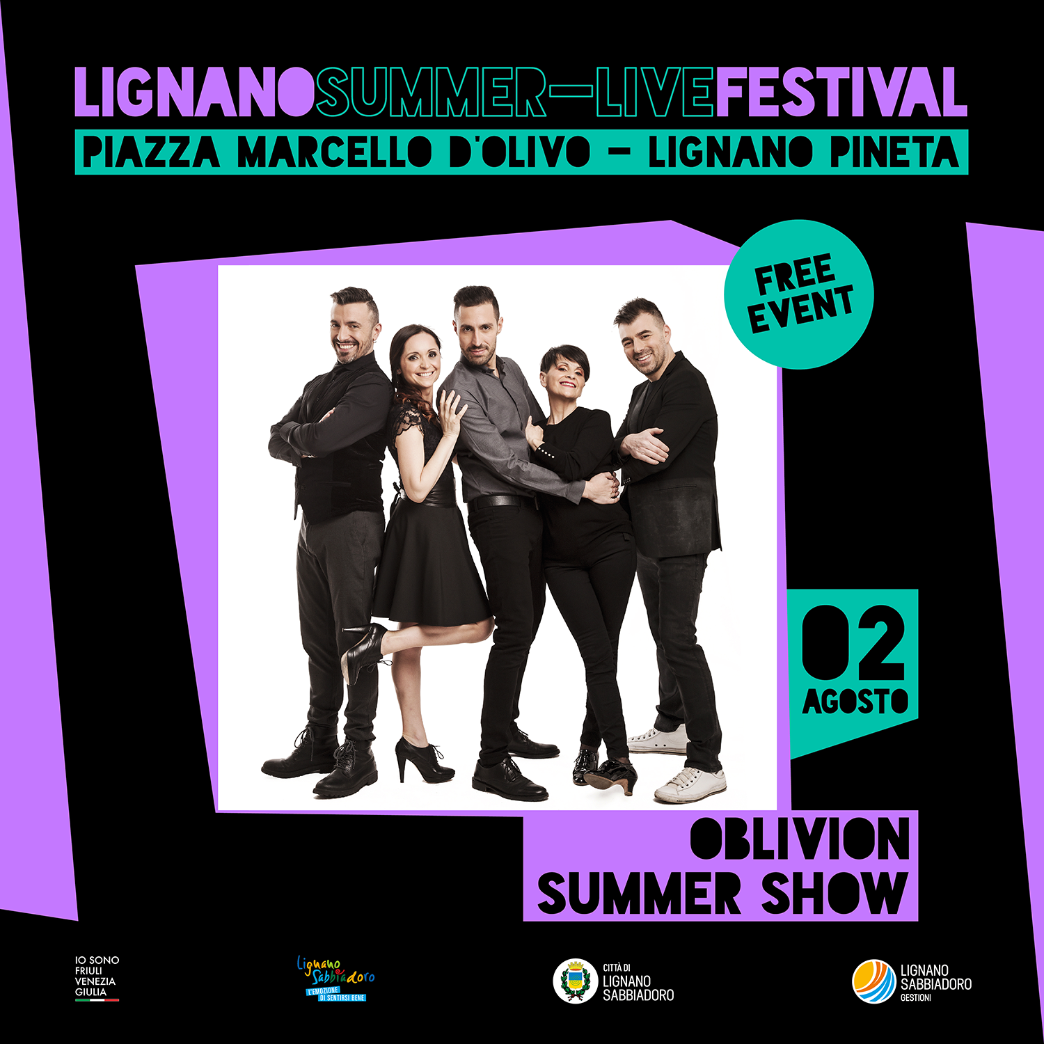 Oblivion Summer Show, un OGM che spazia tra genio e follia, giocoleria e cabaret, intrattenimento leggero e profonda demenzialità. Gli Oblivion è un gruppo composto da Graziana Borciani, Davide Calabrese, Francesca Folloni, Lorenzo Scuda e Fabio Vagnarelli, nato nel 2003 a Bologna. Dopo il loro incontro trascorrono anni intensi spesi nel teatro di rivista e nei musical, poi nel 2009 diventano notissimi al grande pubblico grazie al loro video su YouTube I Promessi Sposi in 10 minuti, micro-musical visto ed emulato da milioni di utenti. Negli anni successivi hanno avuto grande successo con diversi progetti artistici, mash-up e spettacoli teatrali che li hanno portati ad essere riconosciuti come “i cinque sensi della satira musicale, i cinque continenti della parodia, i cinque gradi di separazione fra i Queen e Gianni Morandi”. Gli Oblivion giocano con la musica e il teatro. Sono uno Spotify vivente che mastica le note e le digerisce in diretta in modi mai sentiti prima. Attenzione: assistere ai loro show è un'esperienza folle e irripetibile che provoca risate scomposte, isteria collettiva, ma soprattutto interminabili richieste di bis.