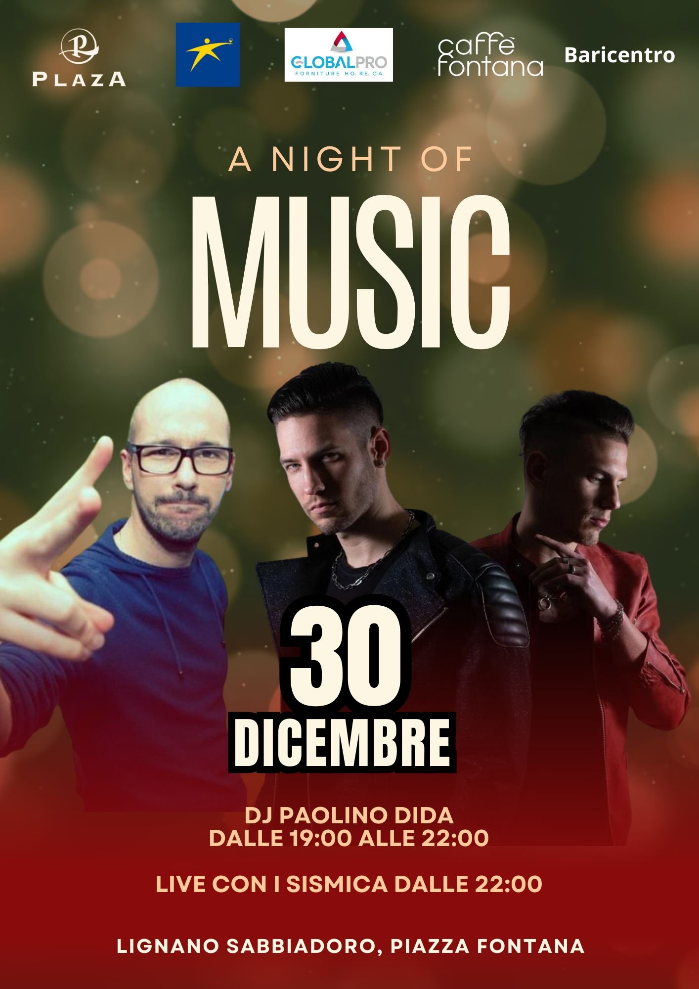 A Night of Music. Sabato 30 dicembre in Piazza Fontana vi aspetta una serata all'insegna della musica. Si inizia alle 19.00 con l'intrattenimento musicale del dj Paolino Dida e a seguire dalle 22.00 live concert de “I Sismica”.