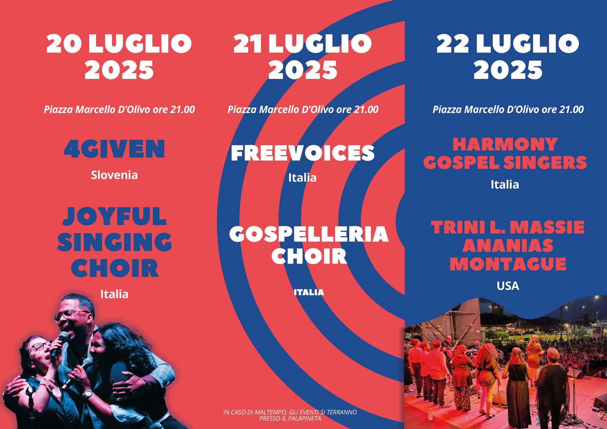 Una tre giorni dedicata alla musica gospel con ospiti internazionali quali: Trini L. Massie, Ananias Montague (USA), Harmony Gospel Singers (Italy), 4given (Slovenia), Joyful Singing Choir (Italy), Freevoices (Italy) e Gospelleria Choir (Italy).