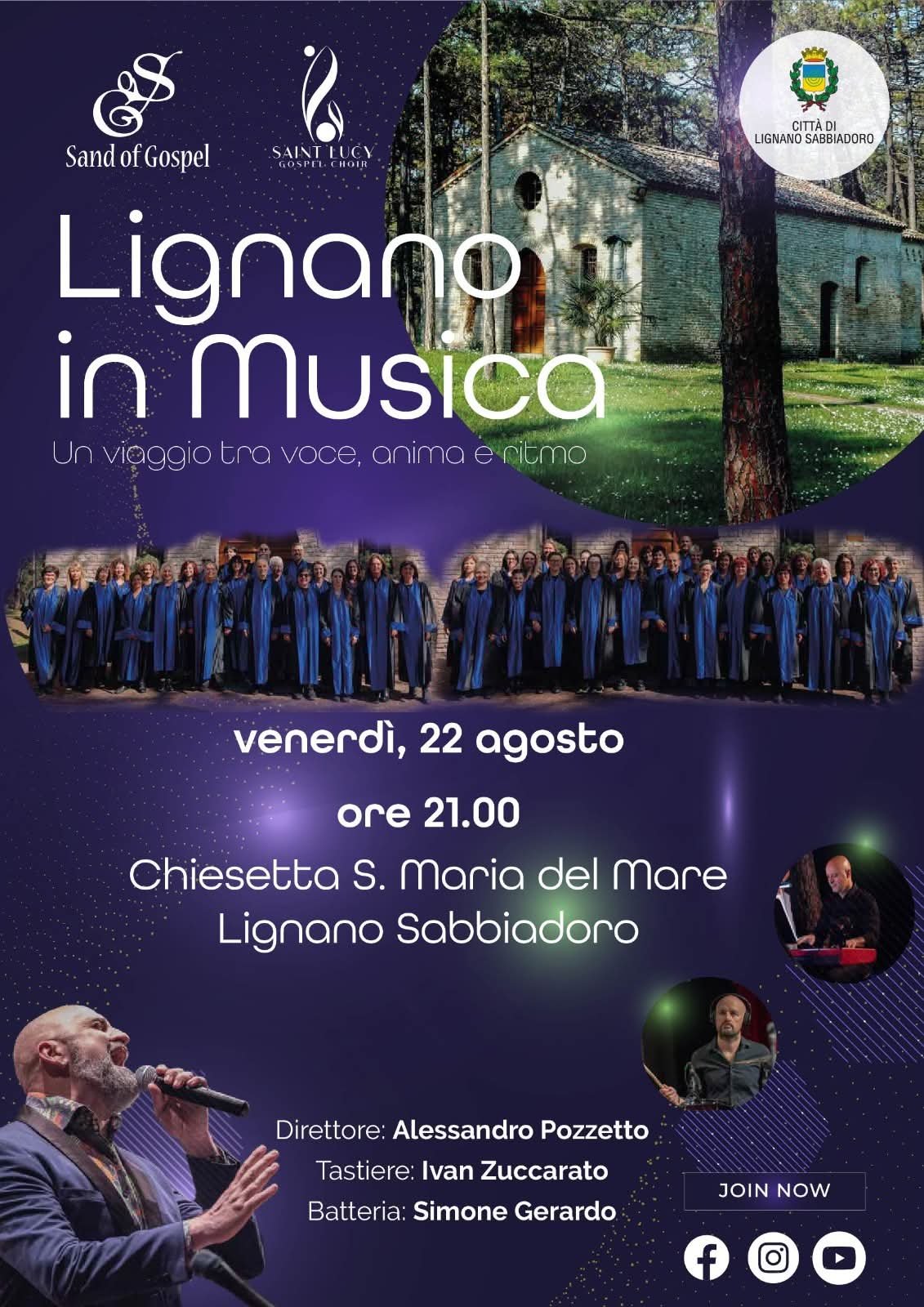 Venerdì 22 agosto alle 21:00, sotto le chiome dei pini che circondano la suggestiva chiesetta di Santa Maria del Mare, torna l’ormai tradizionale concerto Gospel proposto, dal 2018, dal coro di Lignano Sabbiadoro Sand of Gospel, insieme agli amici del Saint Lucy Gospel Choir di Prata di Pordenone, diretti da Alessandro Pozzetto.