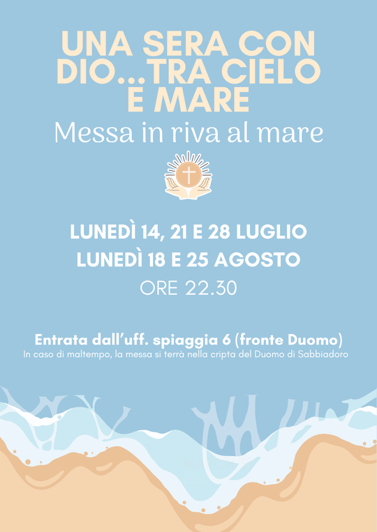 Lunedì 14, 21 e 28 luglio e lunedì 18 e 25 agosto si svolge la Santa Messa in riva al mare, presso la battigia dell'ufficio spiaggia 6 di Sabbiadoro.