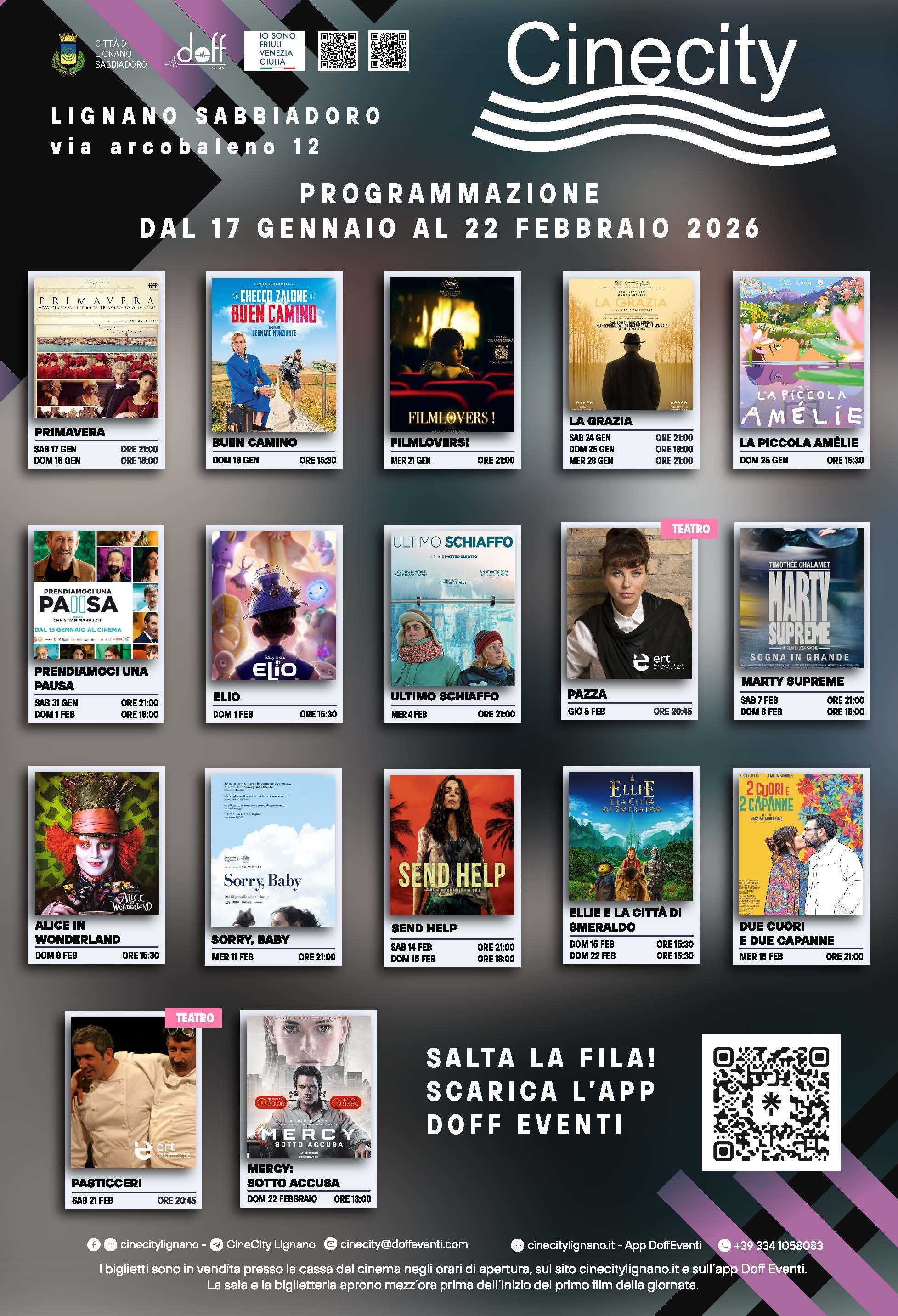 Per consultare l’intero programma con tutti gli orari e i titoli disponibili, è possibile scaricare la brochure completa sul sito ufficiale: www.cinecitylignano.it.
