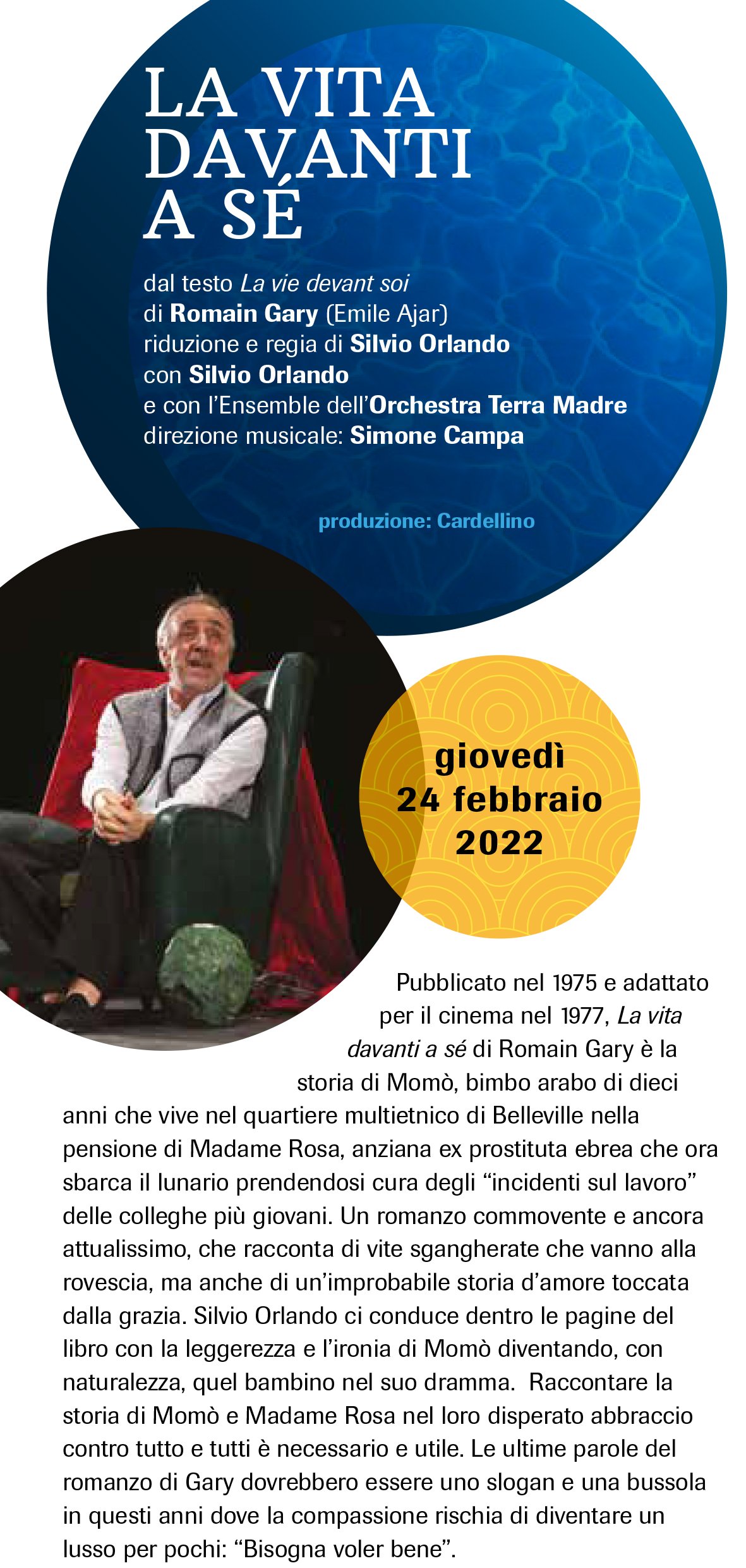 Pubblicato nel 1975 e adattato per il cinema nel 1977, La vita davanti a sé di Romain Gary è la storia di Momò, bimbo arabo di dieci anni che vive nel quartiere multietnico di Belleville nella pensione di Madame Rosa, anziana ex prostituta ebrea sbarca il lunario prendendosi cura degli “incidenti sul lavoro” delle colleghe più giovani. Un romanzo commovente e ancora attualissimo, che racconta di vite sgangherate che vanno alla rovescia, ma anche di un’improbabile storia d’amore toccata dalla grazia. Silvio Orlando ci conduce dentro le pagine del libro con la leggerezza e l’ironia di Momò diventando, con naturalezza, quel bambino nel suo dramma. Raccontare la storia di Momò e Madame Rosa nel loro disperato abbraccio contro tutto e tutti è necessario e utile. Le ultime parole del romanzo di Gary dovrebbero essere uno slogan e una bussola in questi anni dove la compassione rischia di diventare un lusso per pochi: “Bisogna voler bene”.