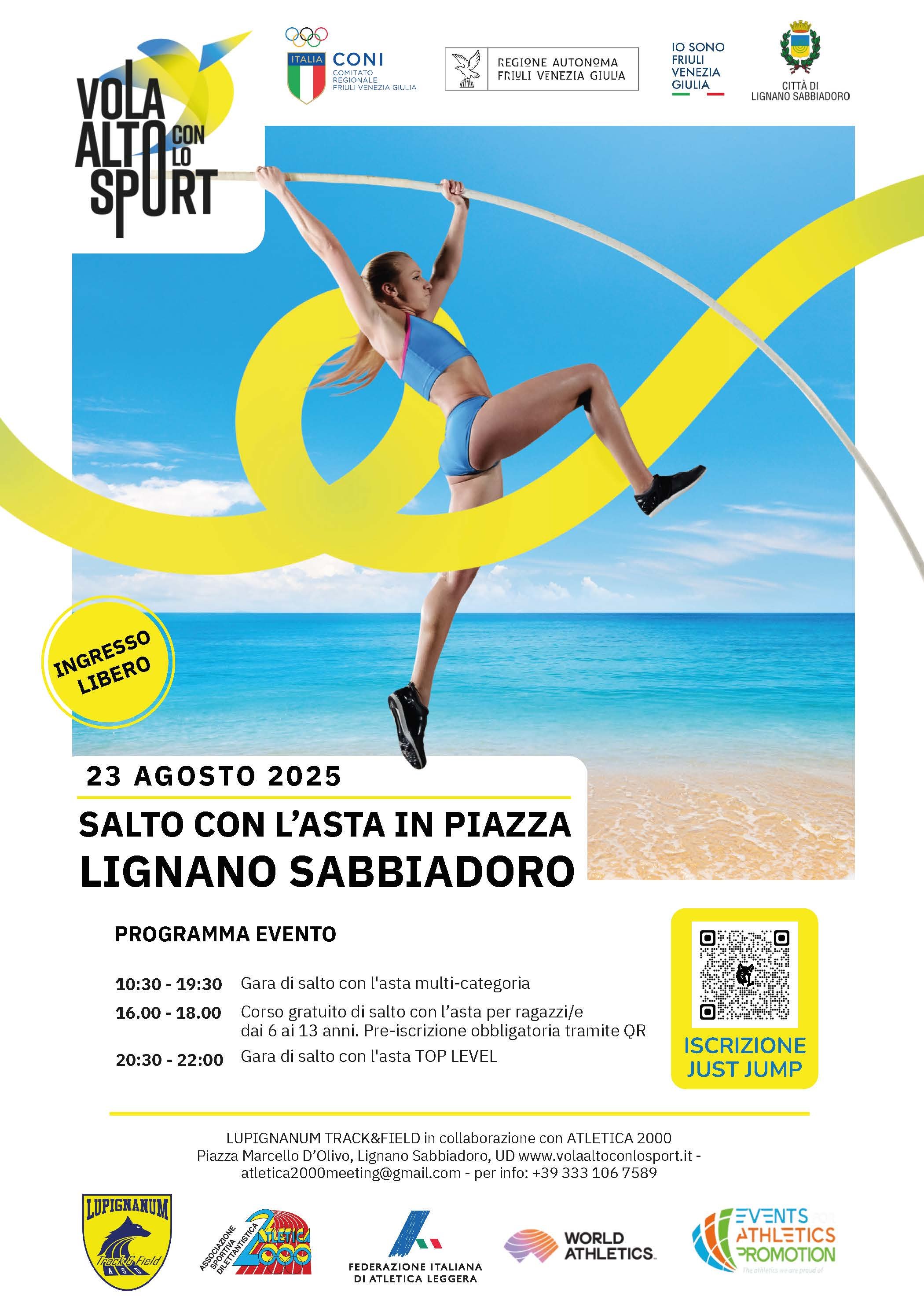 Sabato 23 agosto a Lignano Pineta si svolgerà l'evento Vola alto con lo sport, una giornata all'insegna del salto con l'asta, tra gare e un corso per conoscere questa afscinante disciplina dell'atletica leggera.
