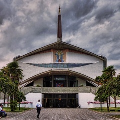 La concezione archittetonica della Chiesa superiore è dinamica nel gioco ridondante dei volumi, sviluppato attorno al perno centrale dell’altare, prolungato all’esterno dall’audacissima guglia, nel plasticismo del soffitto in cemento armato, che si gonfia come le vele di una imbarcazione sospinte dal vento, nonché nel ricco cromatismo delle vetrate, a simboleggiare l’esaltazione della luce e del mare.